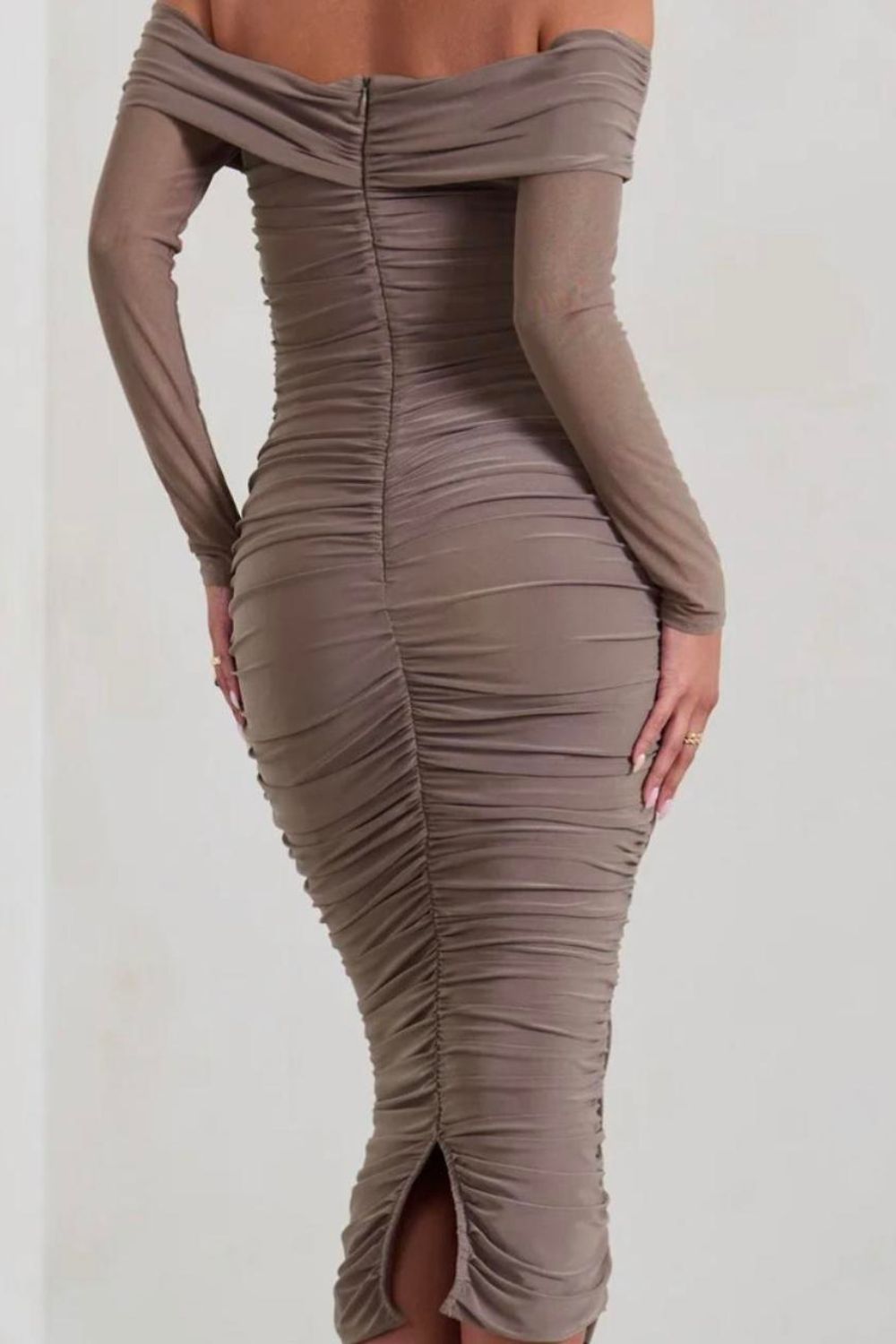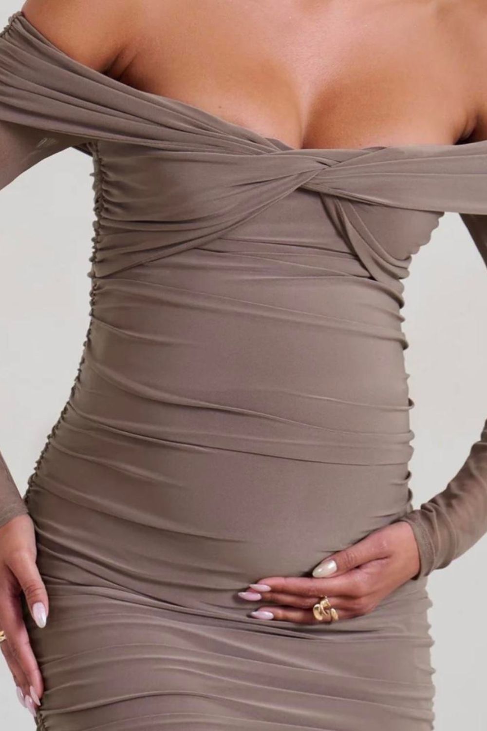 A fine layer of Mocha Brown mesh adds a delicate touch to the Neva maternity dress. Crafted from a luxurious double-lined jersey with plenty stretch for your growing bump, this midi dress boasts a twisted Bardot neckline, long sheer sleeves and ruching throughout.
