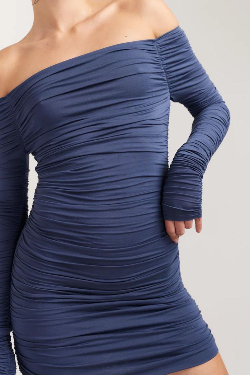Discover the Allegra Mini Dress - an off-shoulder silhouette, crafted in a midnight hue. This super-soft style features complimentary ruche detailing throughout, and elongated sleeves. Effortlessly elevate your look by pairing Allegra with a blazer and heels for a night out.