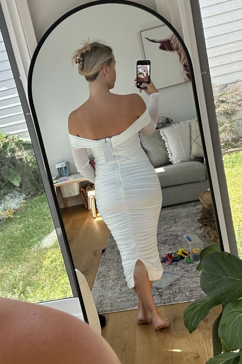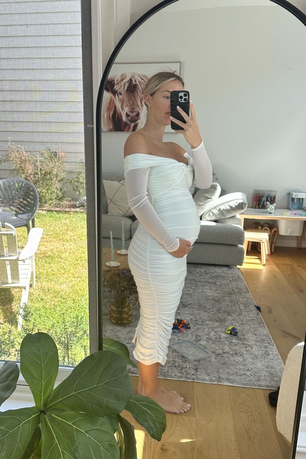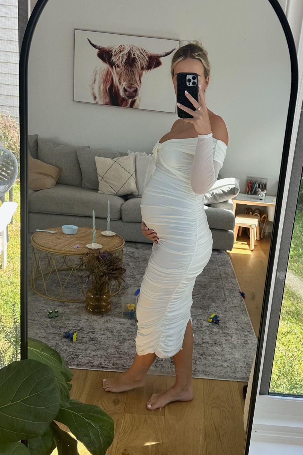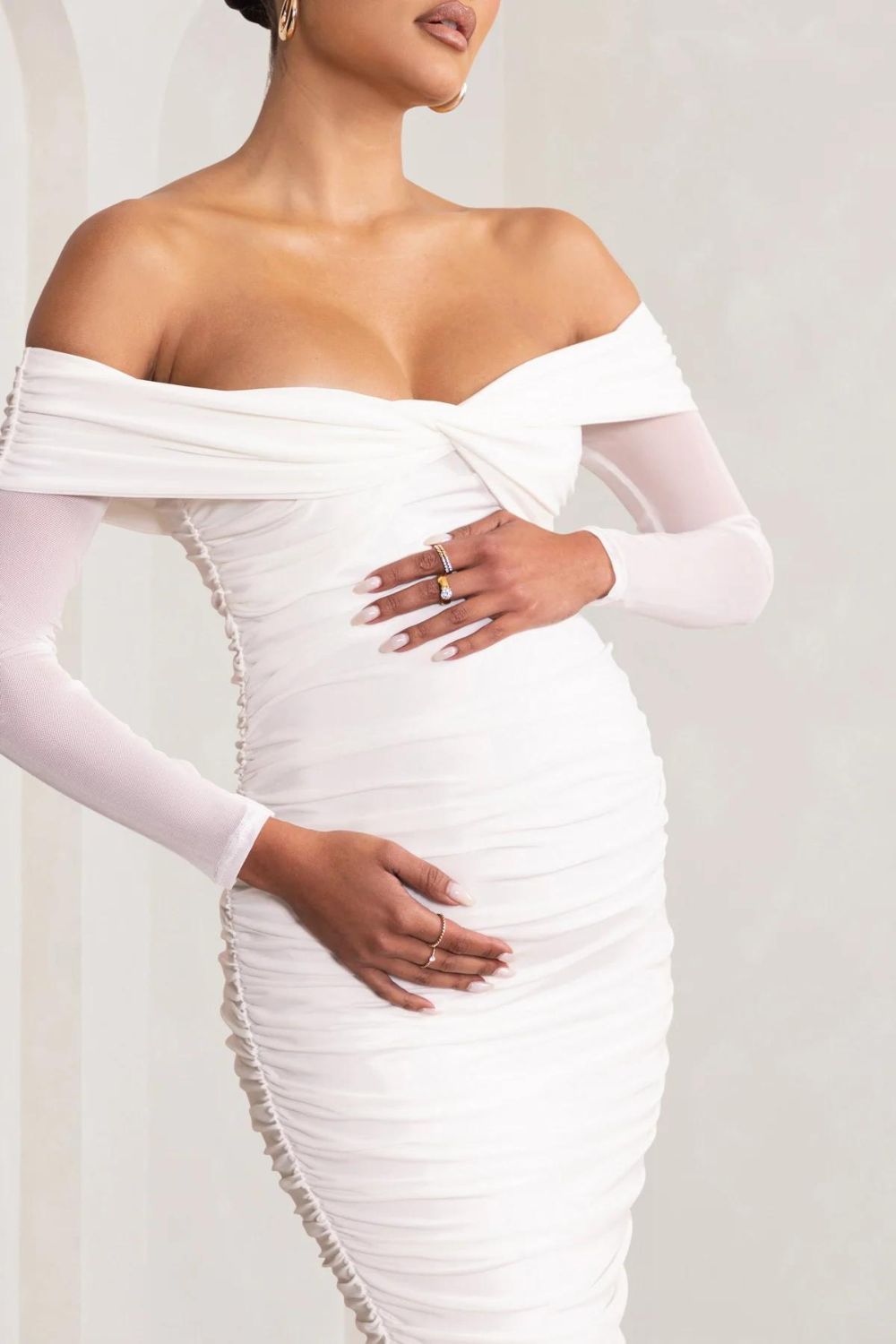 A fine layer of soft white mesh adds a delicate touch to the Neva maternity dress. Crafted from a luxurious double-lined jersey with plenty stretch for your growing bump, this midi dress boasts a twisted Bardot neckline, long sheer sleeves and ruching throughout.