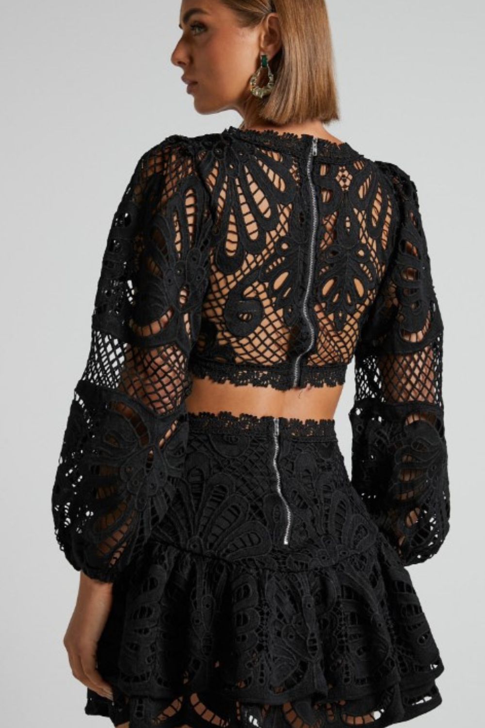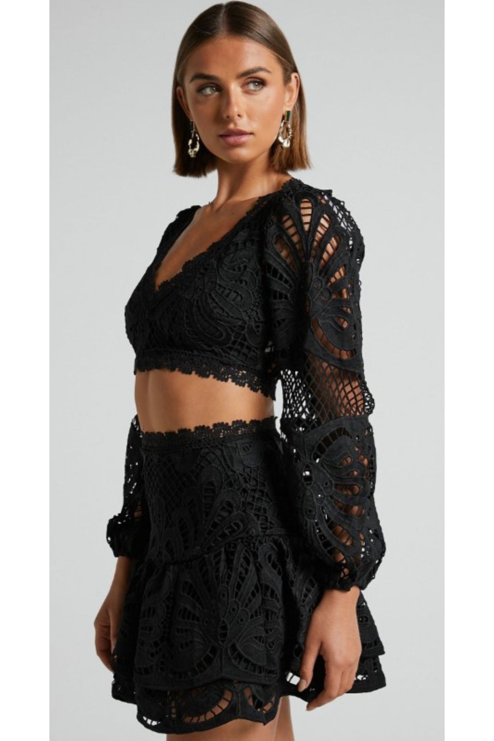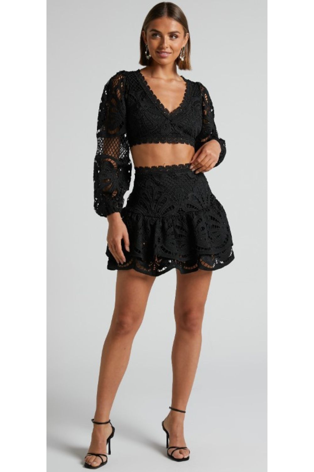 This chic and feminine set will be a new favourite for special events and occasions. It features a long sleeve crop top with a V-neckline, lace trimming and sheer sleeves, and a mini skirt with a double layered ruffle hem.